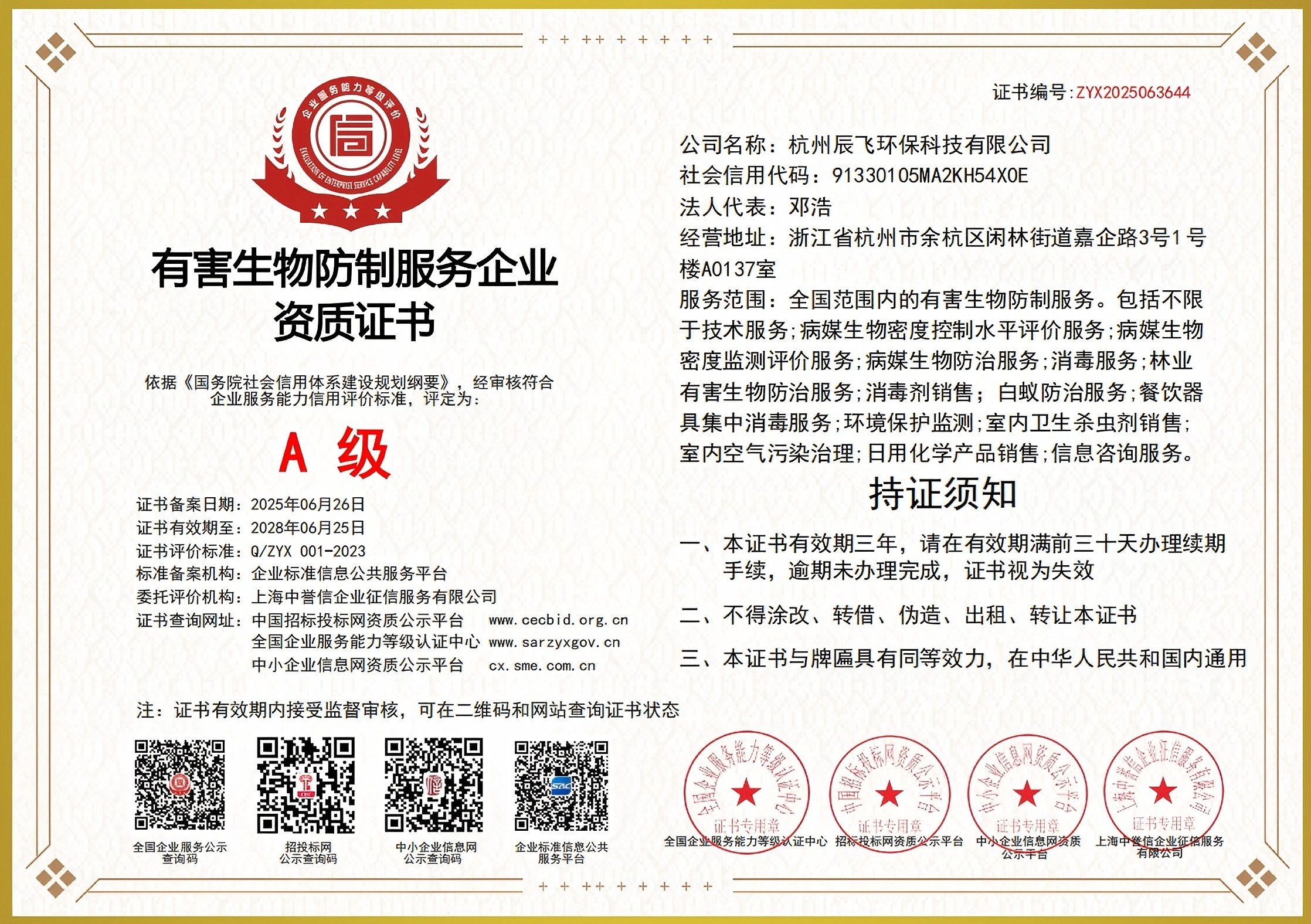杭州辰飛環(huán)保科技有限公司是一家專業(yè)的PCO有害生物防治服務機構。是經杭州市工商局注冊登記、杭州市白蟻防治管理所、PCO協會批準的城市害蟲綜合治理消殺公司,是集除四害、白蟻消殺、除蟲、消毒殺菌、室內空氣污染治理、藥械銷售于一體的大型專業(yè)杭州有害生物防治科技有限公司。主要從事新建、擴建、改建、裝飾裝修單位建筑物的白蟻防治和白蟻預防工程,同時從事工廠、酒店、企事業(yè)單位、住宅小區和家庭的”四害”消殺和白蟻防治服務,長期向各類型客戶提供杭州白蟻消殺、除蟑螂、除老鼠、除蟲、消毒殺菌等優(yōu)質服務。 本公司自成立以來,秉承“誠信、敬業(yè)、高效、務實”的發(fā)展原則,以現...